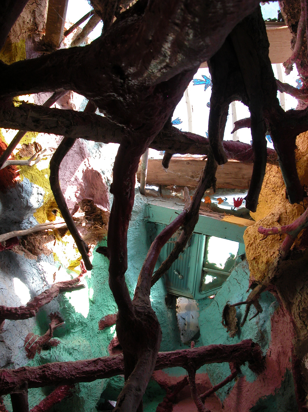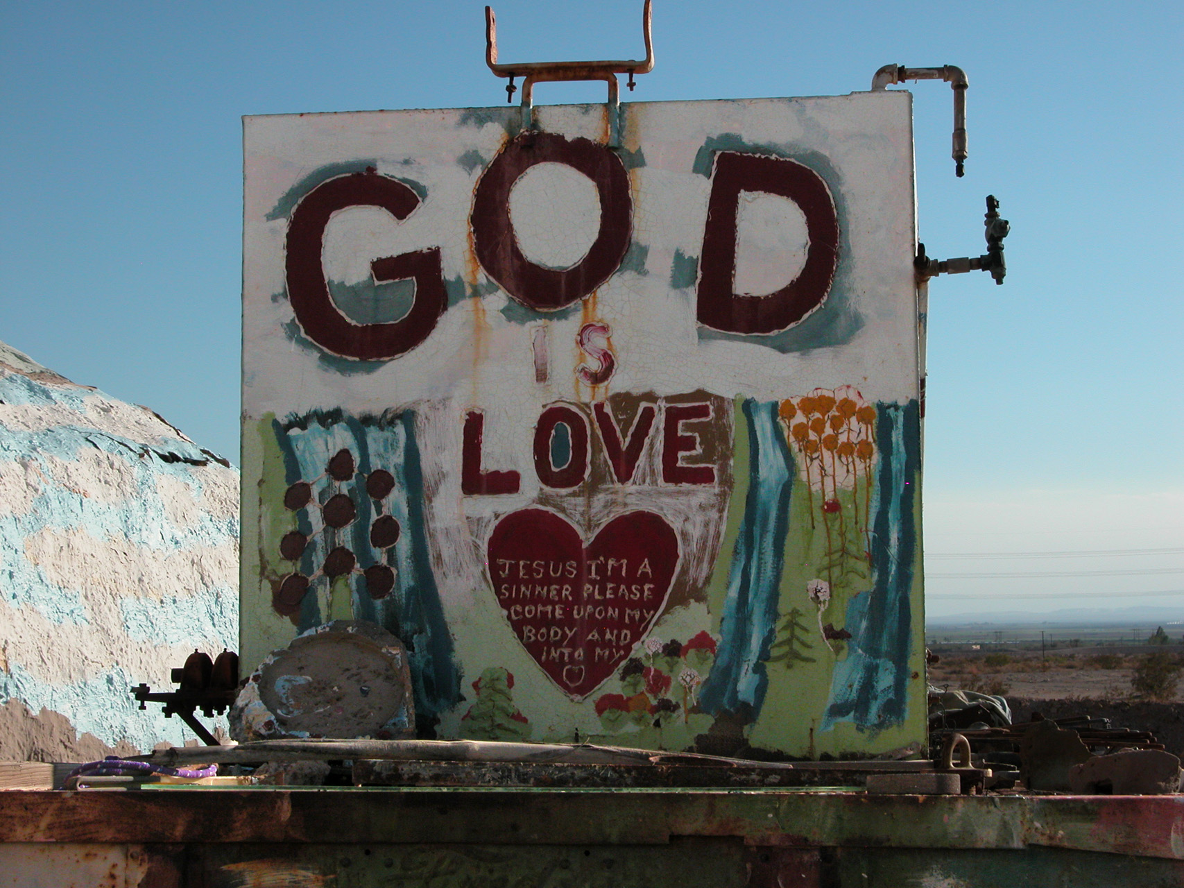 He ran up and greeted our car with a smile and two thumbs up in the glaring midday heat. He insisted on giving us a personal tour, directing us to the yellow brick road, a set of yellow steps carved into the mountain and leading to the top. He took us into a cathedral structure and explained that the support system was composed of car tires and telephone poles. These he covered with paint and adobe flowers, created by punching into a pile of mounded adobe. I particularly liked the car door in the ceiling, taking the mundane to heavenly heights. We sat with Leonard Knight in a tiled shrine, escaping the midday heat while he idly swung a flyswatter. The simple message of Salvation Mountain is God is Love. It’s a hard message to argue with, no matter what your religious persuasion. As he left us to wander around by ourselves and take our fill of pictures, he ran up and greeted the next car in the same way, starting them on the tour.