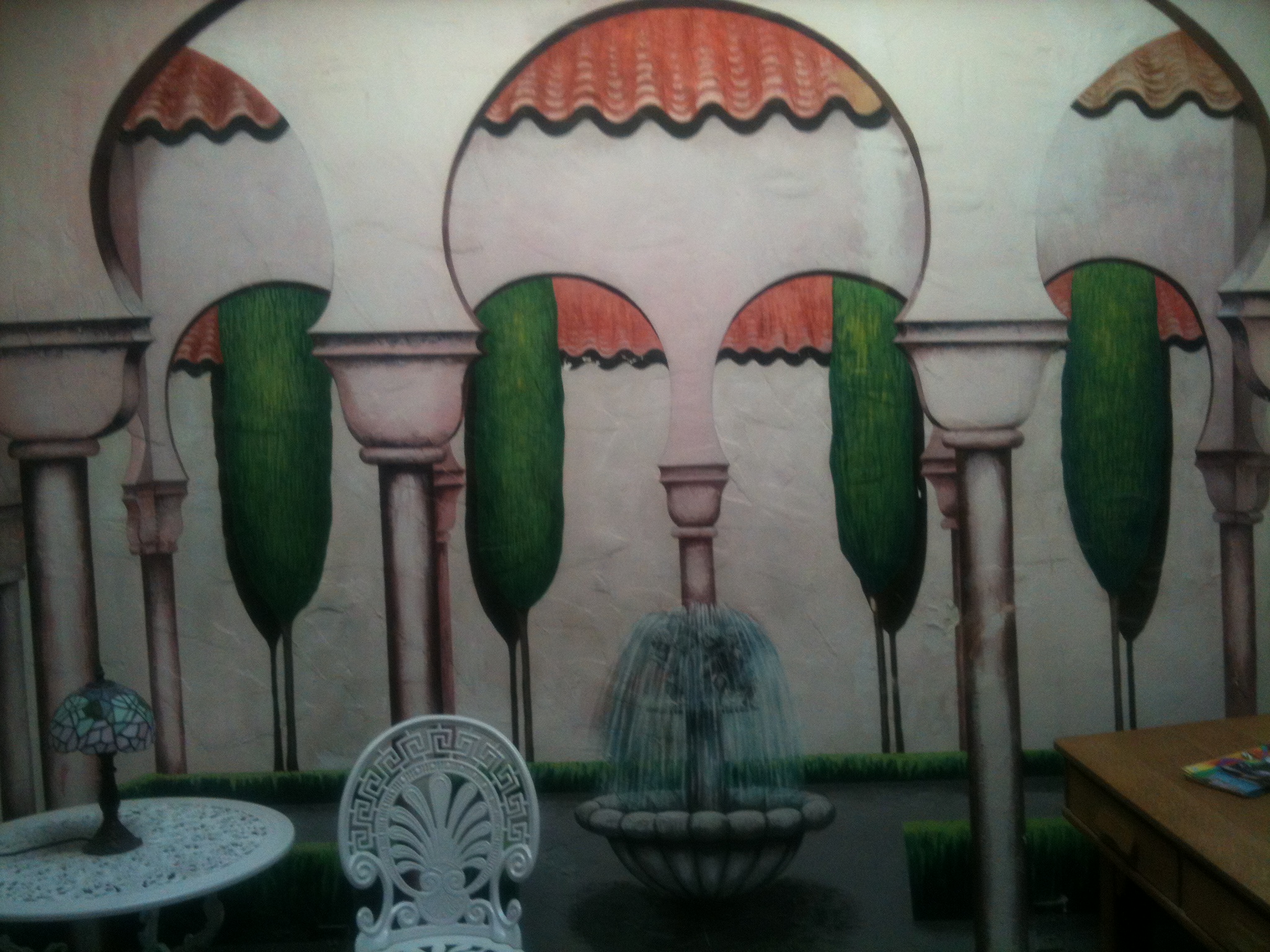 We walked down the plush carpeted hallway, part of a bad remodel from the 70s, and into the open rooms. I didn’t know why the rooms were open and felt a fear creep up that we would be caught snooping around. When I realized that the rooms were left open for ghost hunters like ourselves I knew the feeling of trespass was coming from somewhere else. We saw the peacock room and the cracked cherub room. We saw the empty picture frame mural and the demented garden mimes. My friend pointed out the blue ceiling on the porch, in the south meant to ward off spirits.