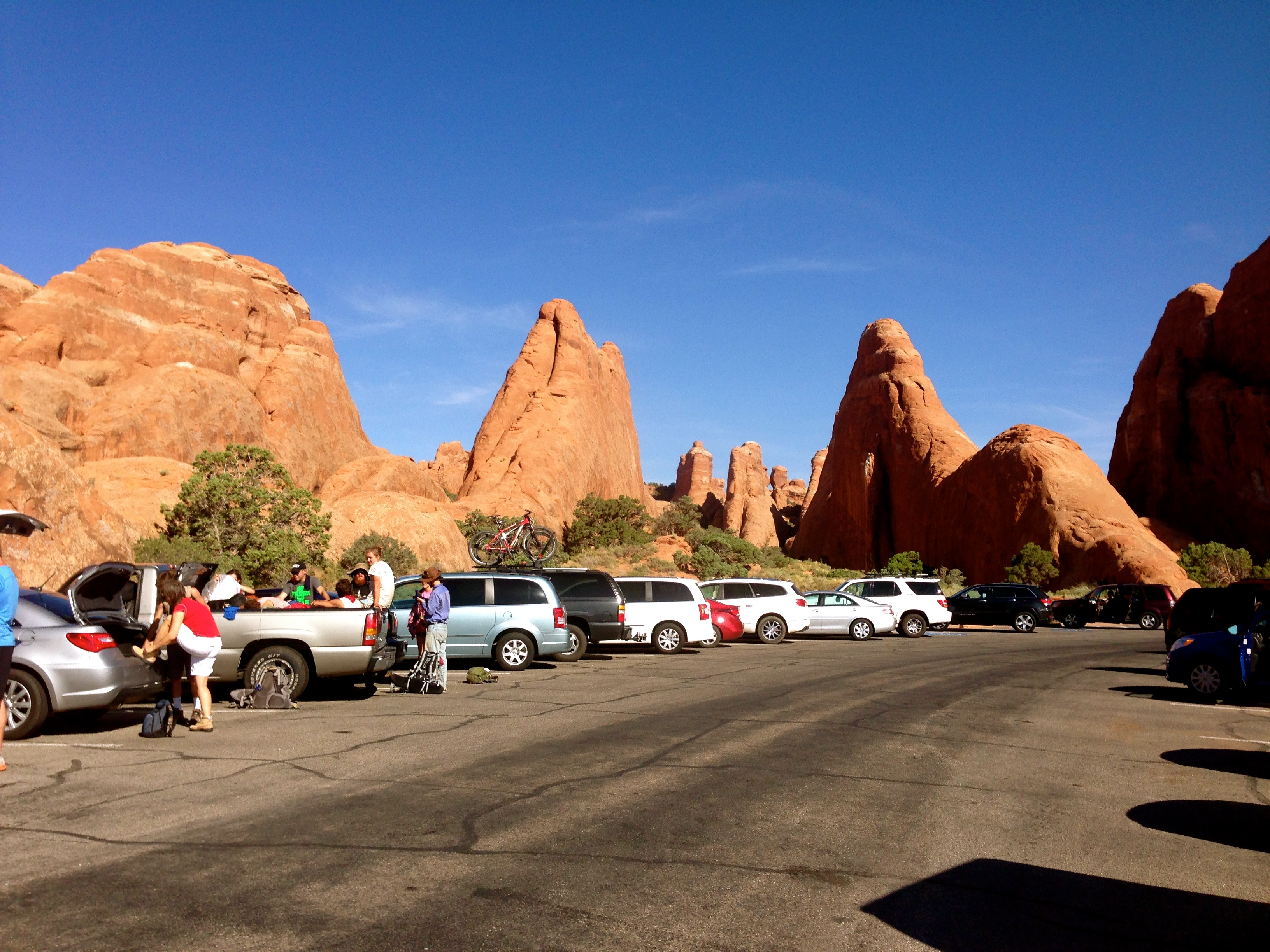When I drove out of Arches a few hours later the day was ramping up. Hundreds of people prepared for hikes in the Devil’s Garden Trailhead region, and tour buses swung past me on the main road. As I passed the park entrance station the line of entering cars was inching up the half-mile from the highway.