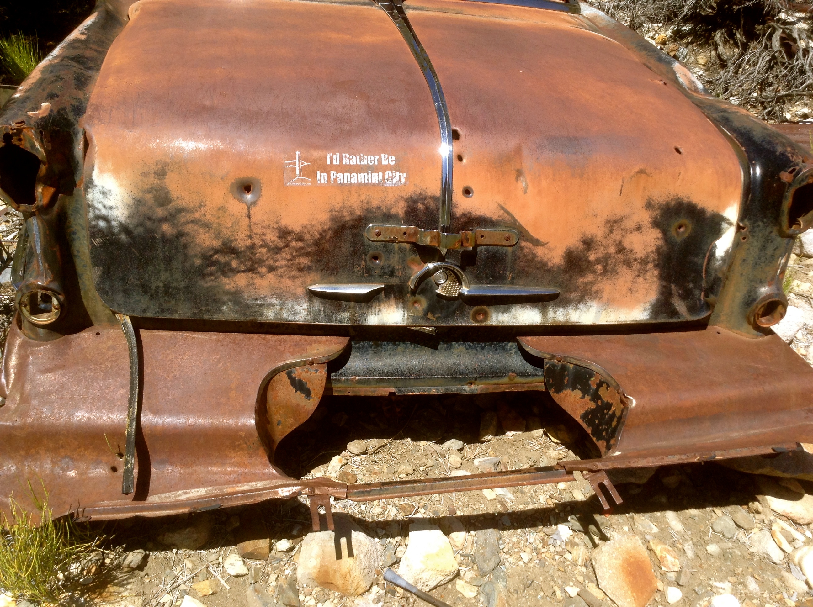Scenic, well-preserved, well watered, and forested with Junipers and Pinyons, there are cabins, a mill and artifacts for days. Hikers have dubbed the biggest cabin the “Panamint Hilton” because of its running water and glass in the windows. Rusted wind chimes dangle from the porch, fashioned by creative hikers, whittling away the time, new sound from found junk. Sourdough Canyon stems off to the north just before town and has a cabin and its own surprises. Water Canyon just beyond Panamint City has an old camp and a running creek. An abandoned 1957 Chevy proves that there used to be a road. It has a bumper sticker that reads: I’d rather be in Panamint City.